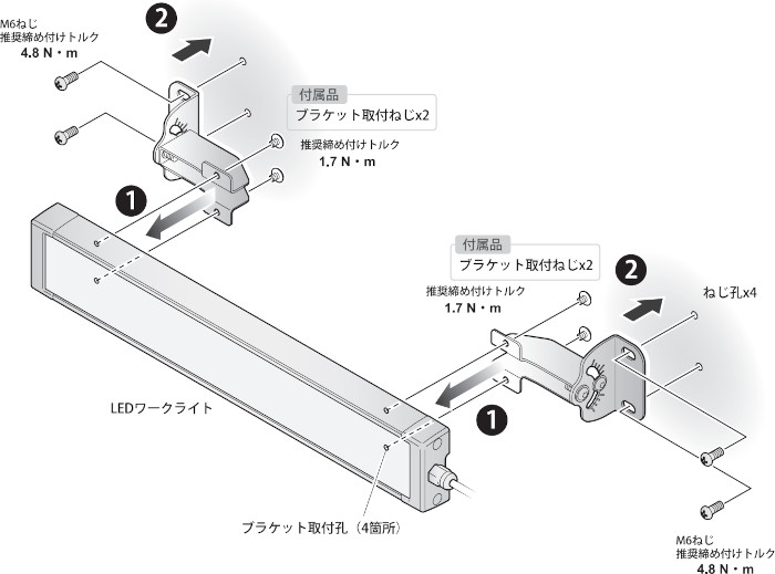 ① LEDワークライト本体にブラケット(SZW-306)を取り付けます。