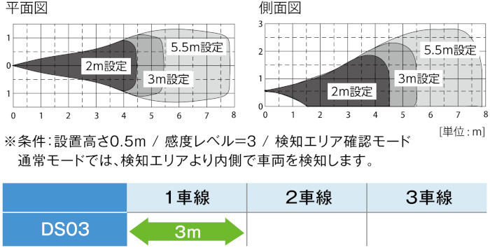 検知距離は、DS03型と検知しようとする車両 ( 上図 ) の距離を示します。
