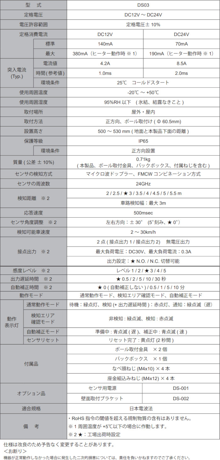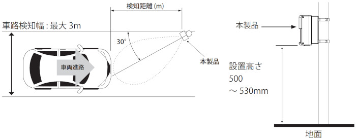 ※マイクロ波の反射を測定して車両を検知していますので低いと地面を検知し、高いと車高の低い車両の検知ができません。