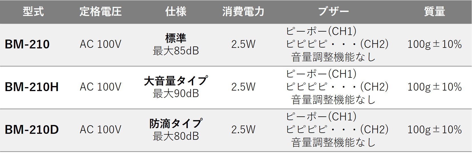 ○超小型ながら90dB(at 1m)の大音量(BM-H型)です。BM型は85dB(at 1m)、BM-D型は80dB(at 1m)