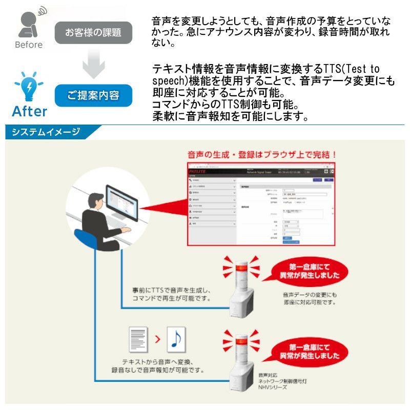 文字情報を音声に変換して登録したり、コマンド制御によってリアルタイムで音声報知が可能です。