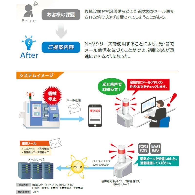 ・メール受信をお知らせするメール検知が行えます。   条件設定に合致したメールを受信した際にLED点灯・音声によって