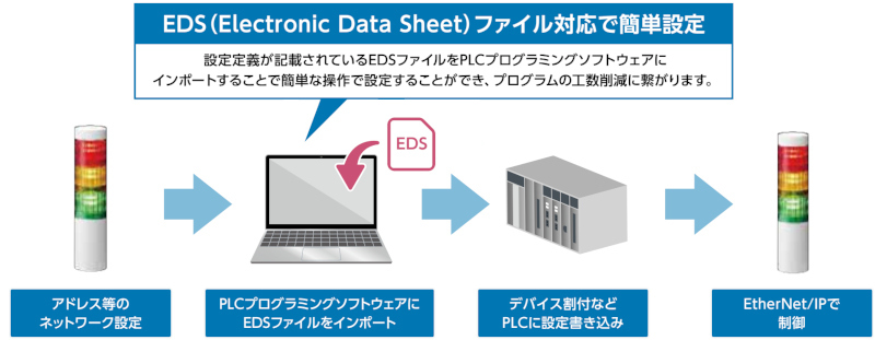 産業用PC・PLCとLAN接続でき、Ethernet通信で制御可能な積層信号灯です。EtherNet/IPプロトコルに対応し、簡単に操作可能。
